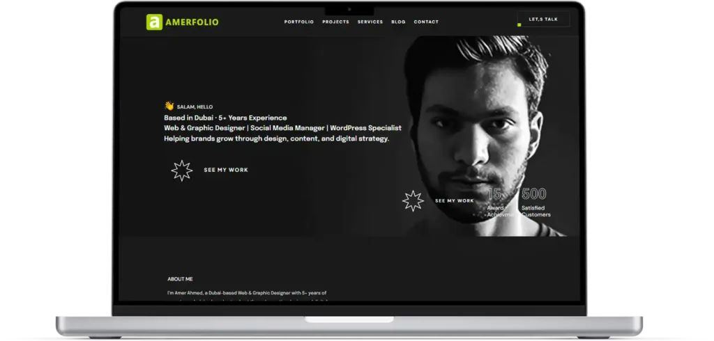 A polished personal portfolio showcasing my expertise in WordPress web design, UI/UX, SEO, and visually compelling web and graphic work — developed with Elementor and Adobe Suite for a seamless, brand-aligned presentation.